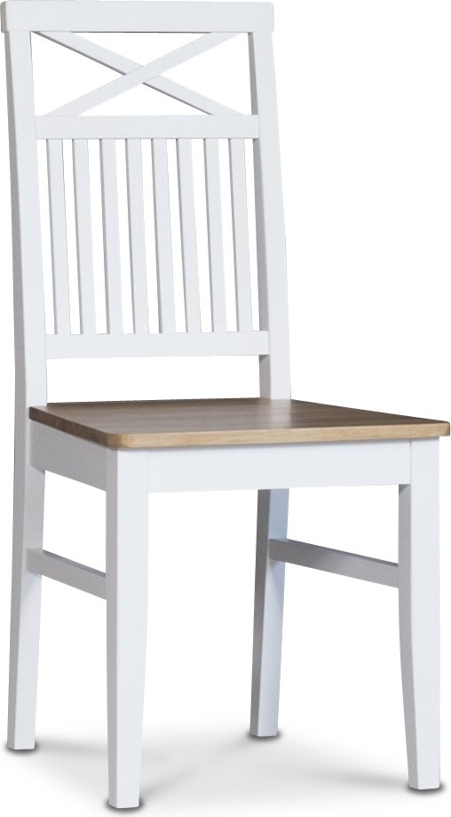Matgrupp från Skånska Möbelhuset, matbord med ek-underrede och bordsskiva i massiv oljad ek. Fyra stycken Dalarös matstolar i vitlackat trä med kryss i ryggen.