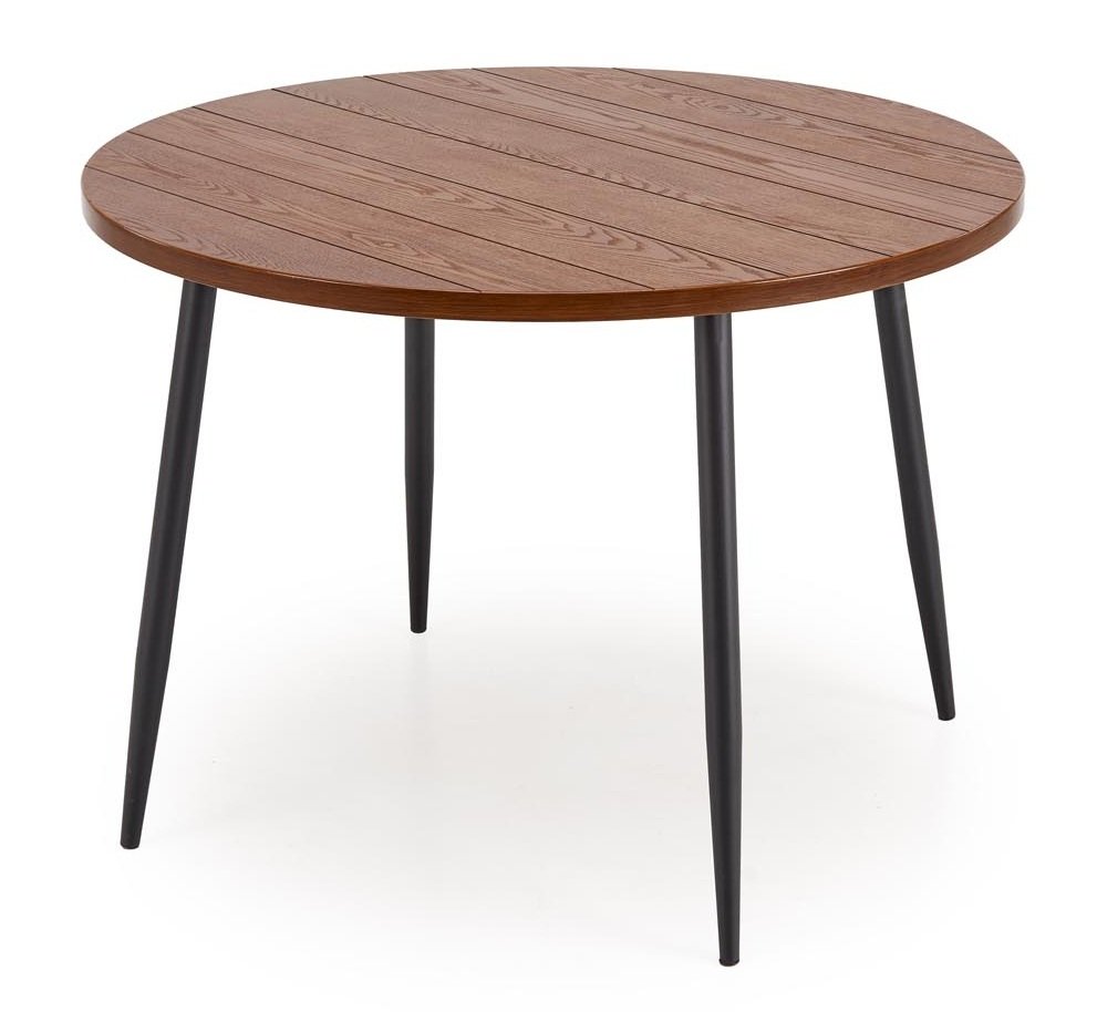 Matgruppen Dana & Alfred förenar varm träkänsla med modern elegans i en balanserad och inbjudande design. Det runda Dana matbordet har en skiva i valnötsmelamin med naturlig trästruktur och subtila längsgående skåror som ger en genuin och stilren karaktär. Det svarta metallunderredet med smala, konformade ben skapar en luftig kontrast till den varma bordsskivan, vilket ger ett elegant uttryck som passar både moderna och klassiska miljöer.
