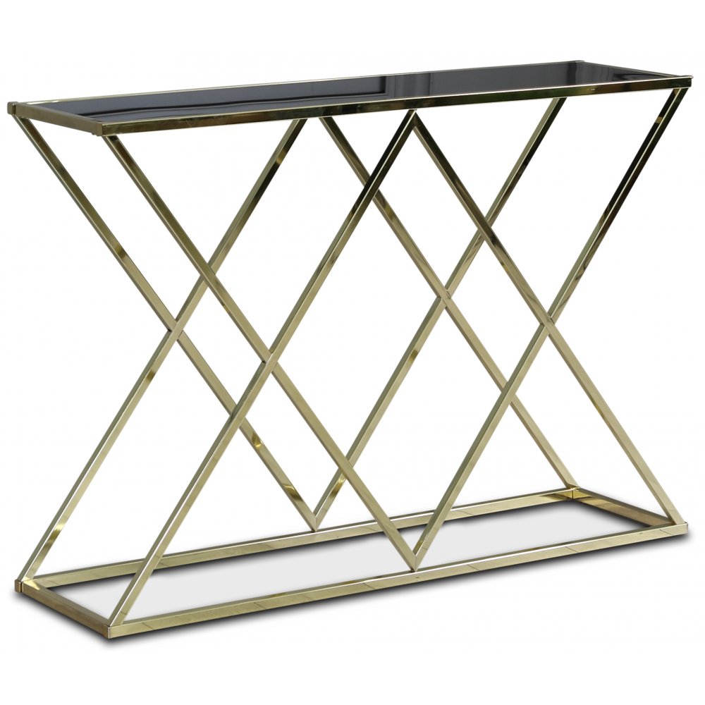 Stilrent konsolbord i blank mässing med toppskiva i mörktonat glas.