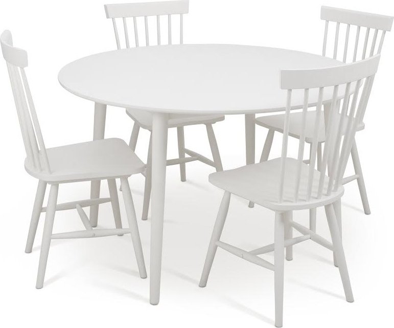 - Matgrupp runt matbord Ø120 cm och 4 vita pinnstolar - Rosvik
