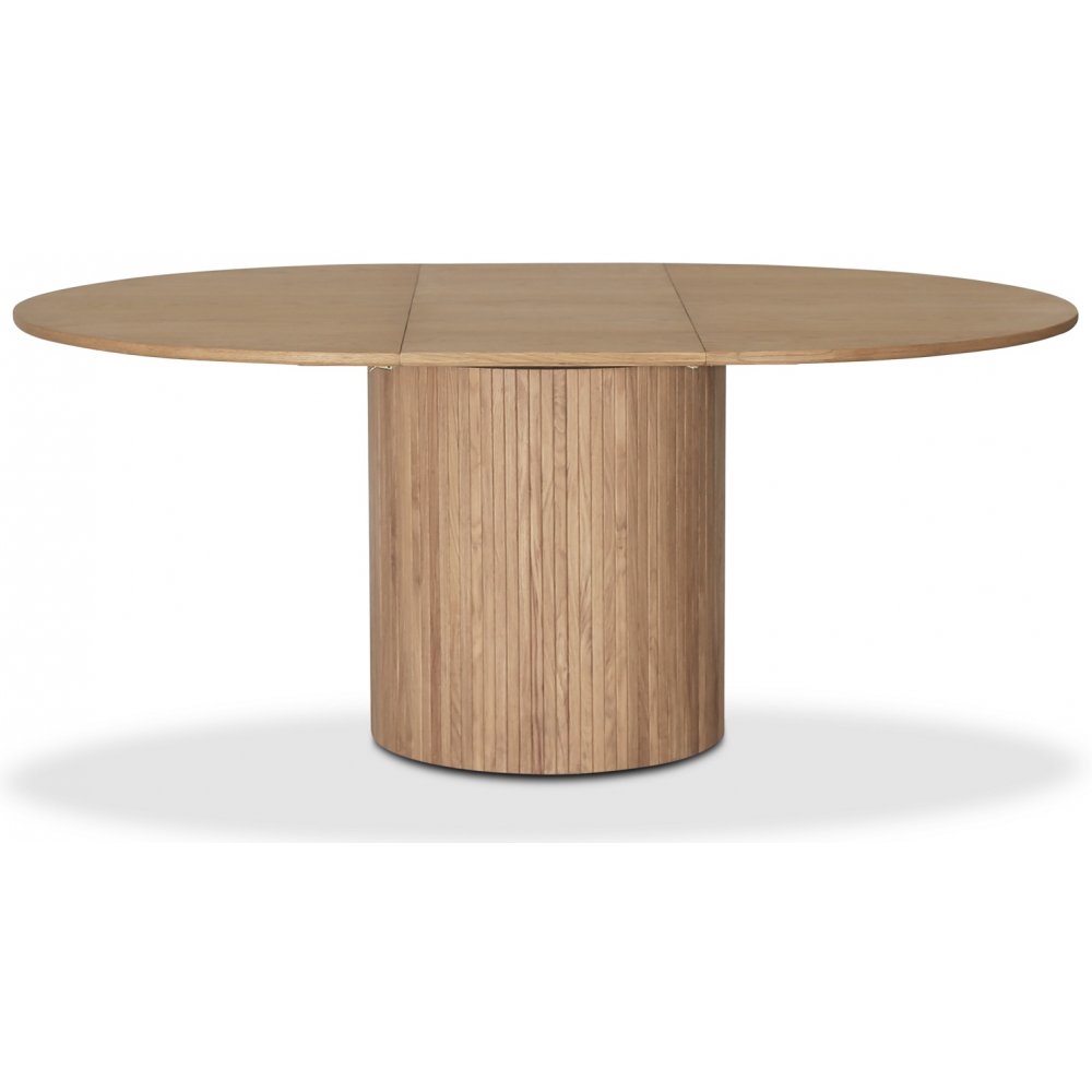 Matbordet är Ø115 cm i diameter, det ingår en tilläggsskiva som förlänger bordet till 160 cm. Iläggsskivan är vikbar och förvaras i bordets mittdel när den inte används. Bordet är byggt både i massivt trä och Fanèr.
