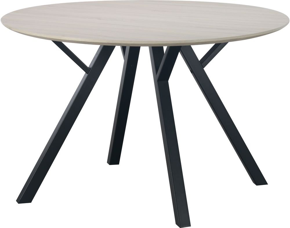 Matgrupp från Skånska Möbelhuset, Smokey matbord 120 cm i diameter med mdf-toppskiva med ljus betsad ekfoliering. Medföljer 4 st matchande Carisma sammetstolar i grått sammet med svarta ben.